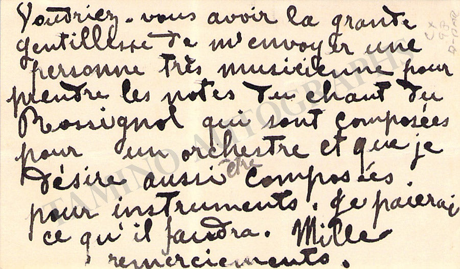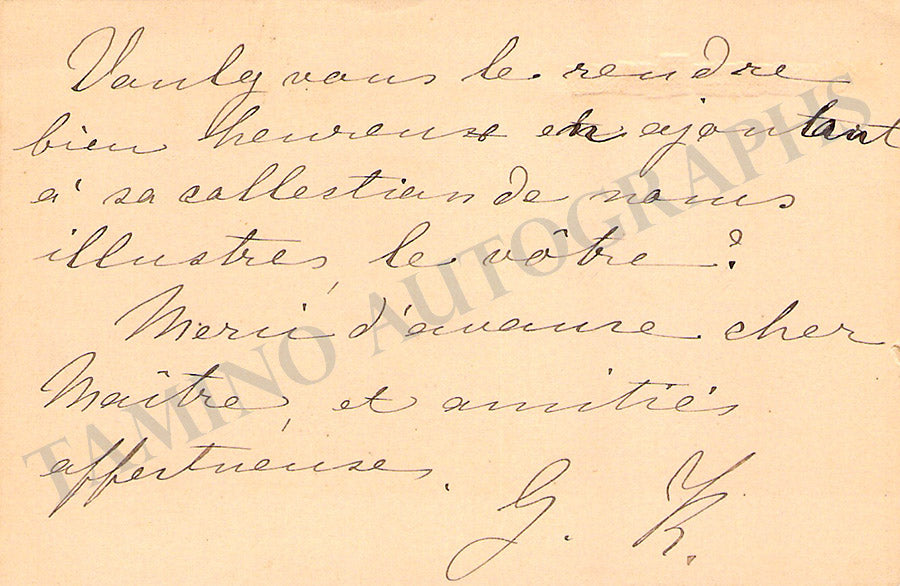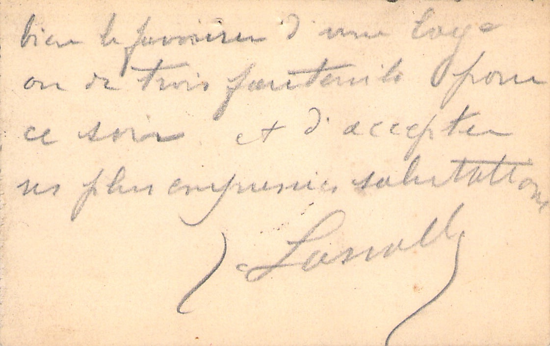His business card signed by him on verso with a short message in French, dated 1908. Size is 3.75 x 2.1 inches, some soft glue residues on the front, overall light age-toning, otherwise in very good condition.