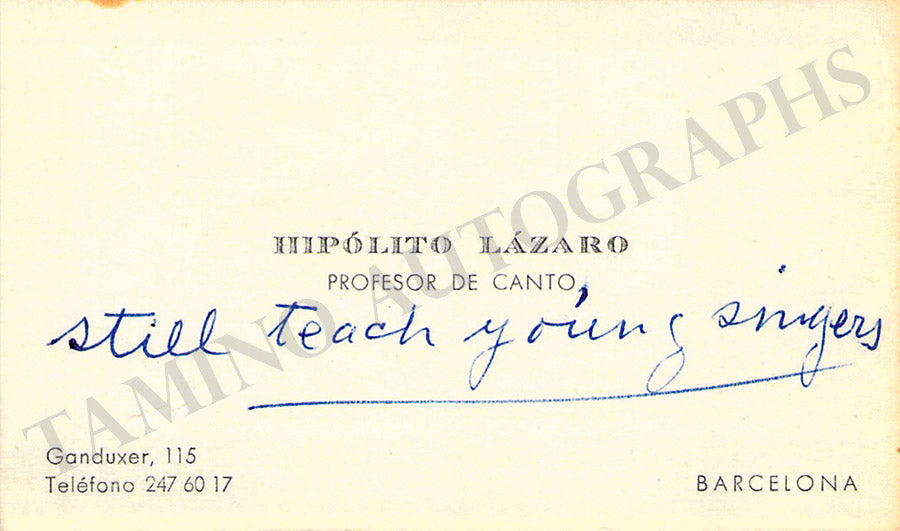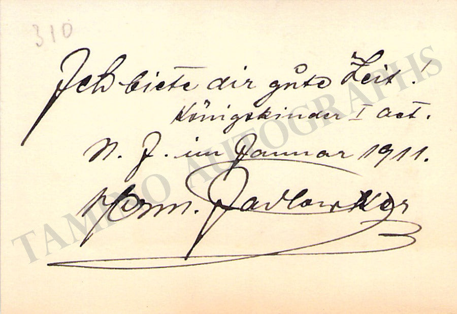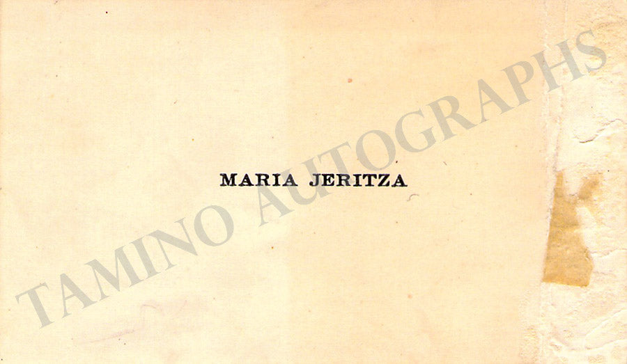 Business card from music fan Gladys Greeley signed by Jadlowker on the back with a short sentiment in German. Size is 2.8 x 2 inches, in excellent condition.