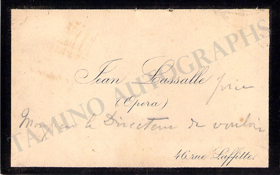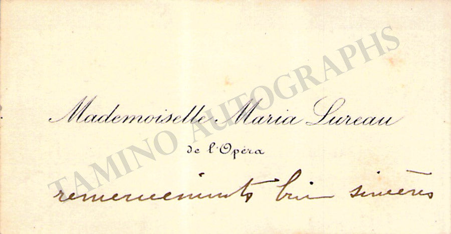 Her business card with a short message in French written by her. Size is 3 x 1.7 inches, overall soft age-toning on the front, evident mounting traces on verso, otherwise in very good condition.