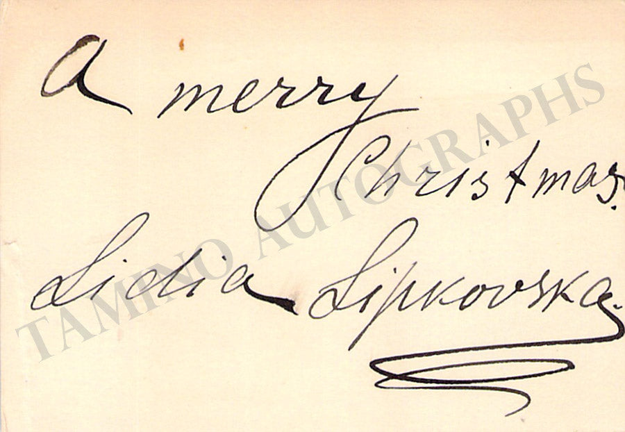 Business card from music fan Gladys Greeley signed by Lipkovska on the back with a Christmas greeting. Size is 2.8 x 2 inches, in excellent condition.