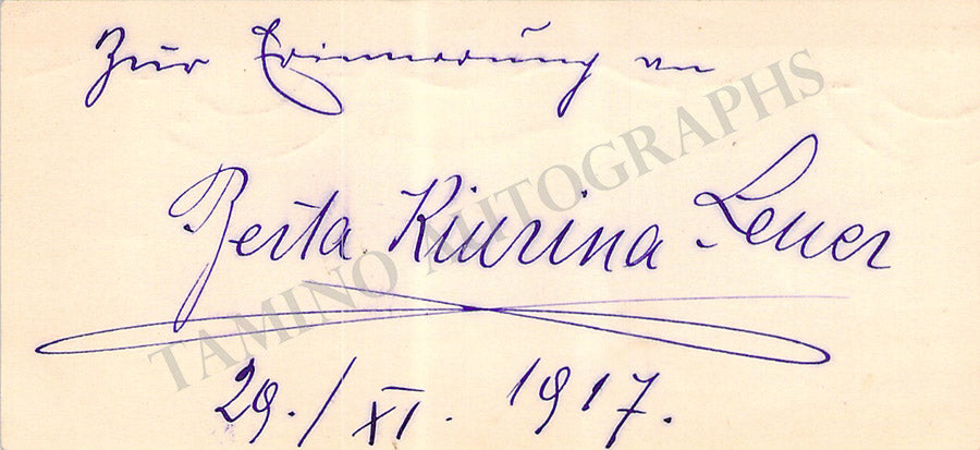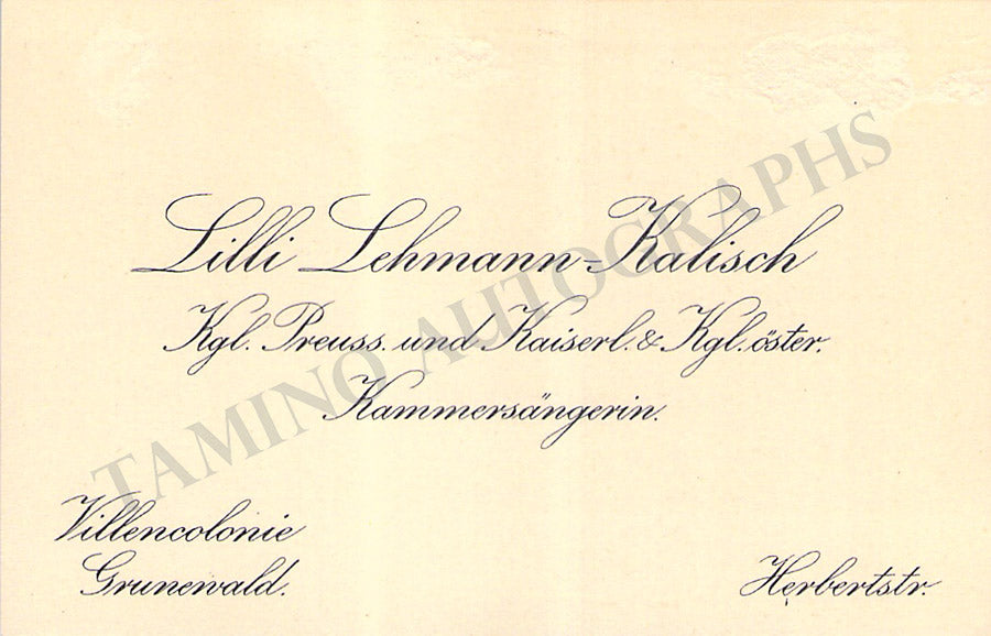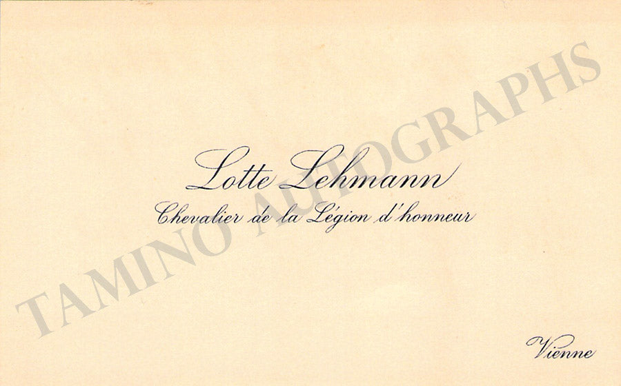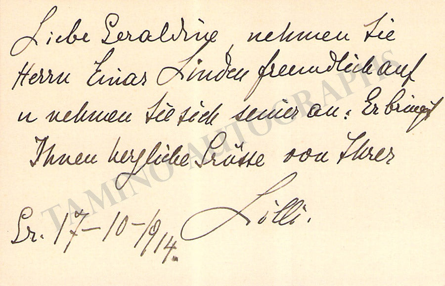 Her business card signed by her on verso as 'Lilli' with a short message in German, dated October 17, 1914. Size 3.7 x 2.4 inches, soft mounting damage on the front upper border, otherwise in very good condition.