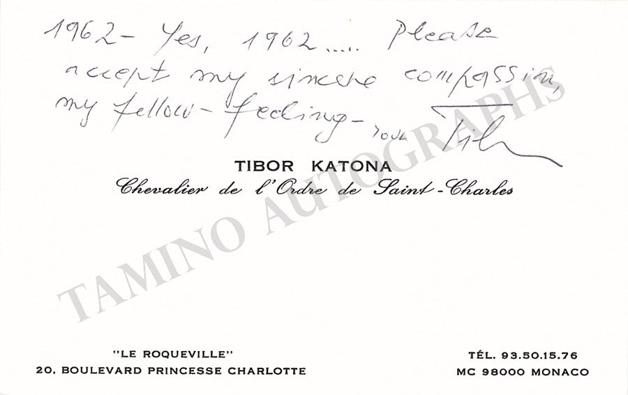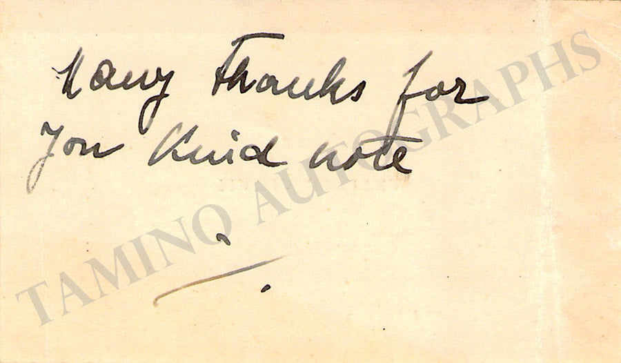 His business card signed by him with a short compassionate message for the loss of one of his friends on front and verso (not shown). Size is 5 x 3.25 inches, in excellent condition.