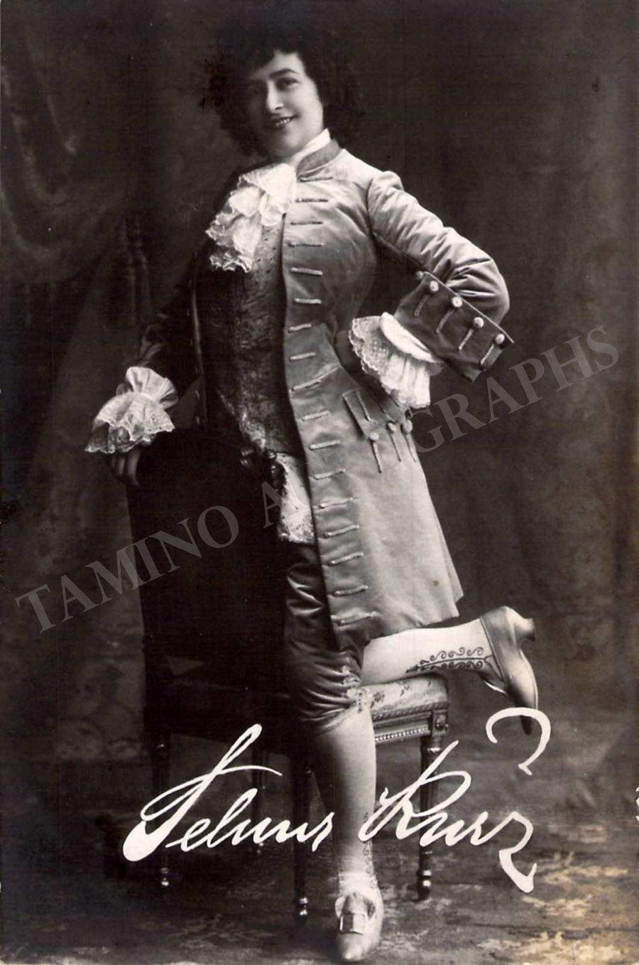 ALSO INCLUDED is an unsigned photo postcard of her in role (printed/facsimile signature in white). Size is 3.5 x 5.8 inches, in excellent condition.