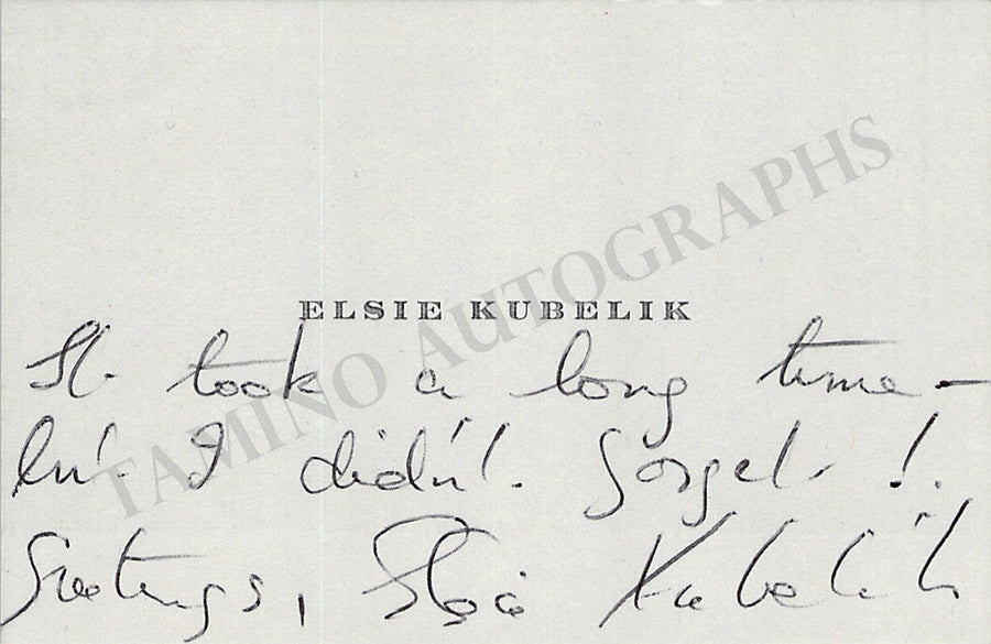 Her business card with a long message in German written by her. Size is 4 x 1.9 inches, overall age-toning, in very good condition.