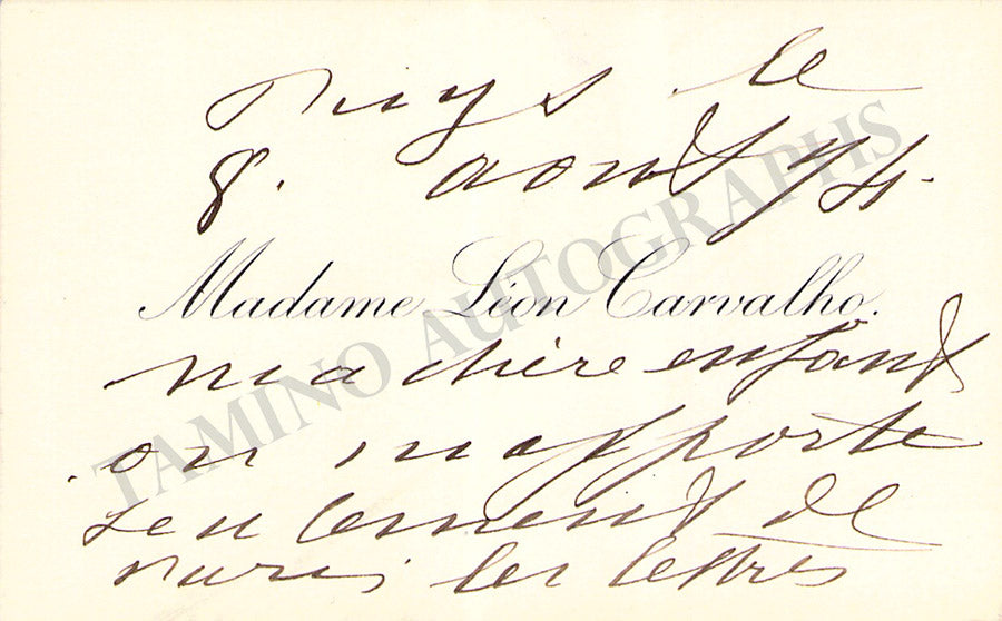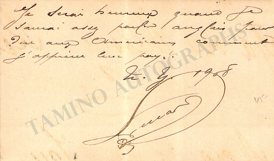 Her business card with a long message in French written by her on the verso. Size is 3.5 x 2.1 inches, overall soft age-toning, otherwise in excellent condition.
