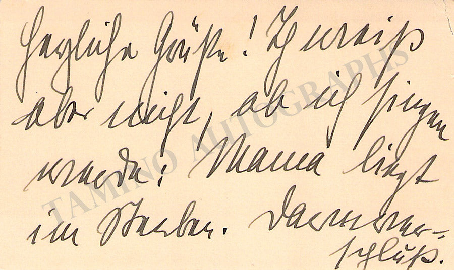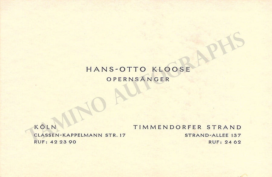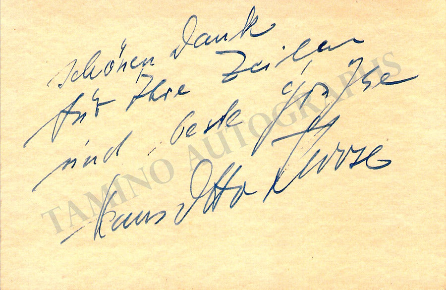 His business card signed by him on verso with a short message in German. Size is 4.75 x 3 inches, soft age-toning, in excellent condition.