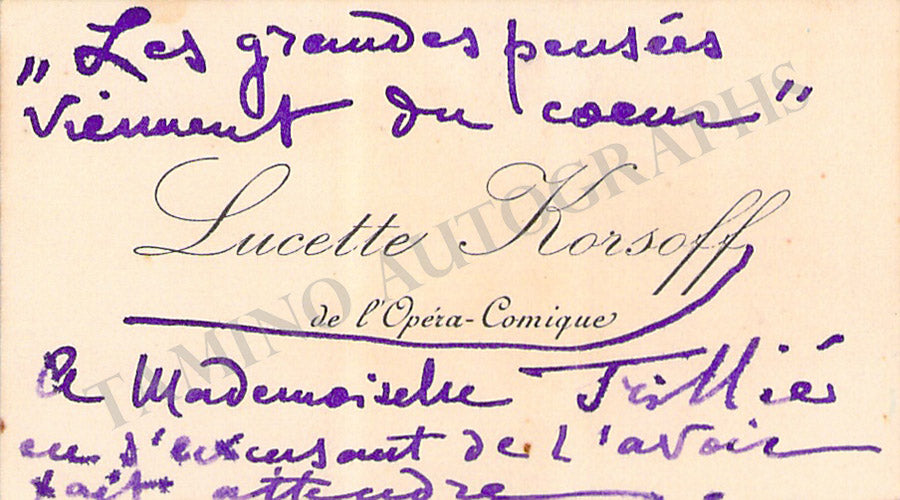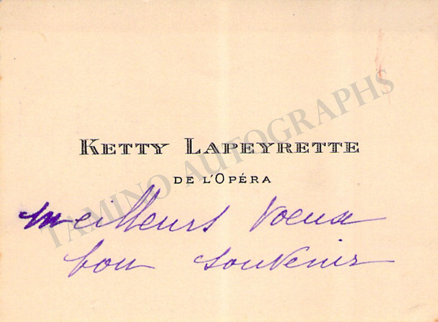 Her business card with a short message written by her in French. Size is 2.7 x 2 inches, overall soft age-toning, in excellent condition.