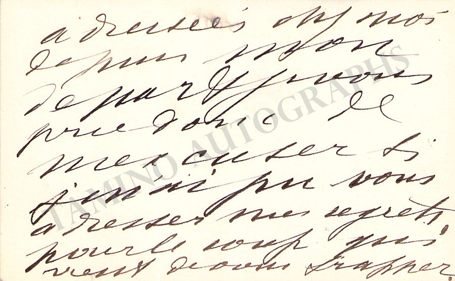 His business card signed by him with a short sentiment in French. Size is 3.6 x 2.7 inches, in excellent condition.