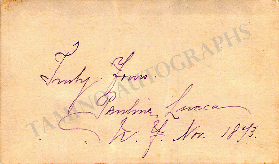 Card signed by her with a short sentiment, dated November 1893. Size is 3.9 x 2.2 inches, overall soft age-toning on the front, evident mounting traces on verso, glue residues, otherwise in good condition.