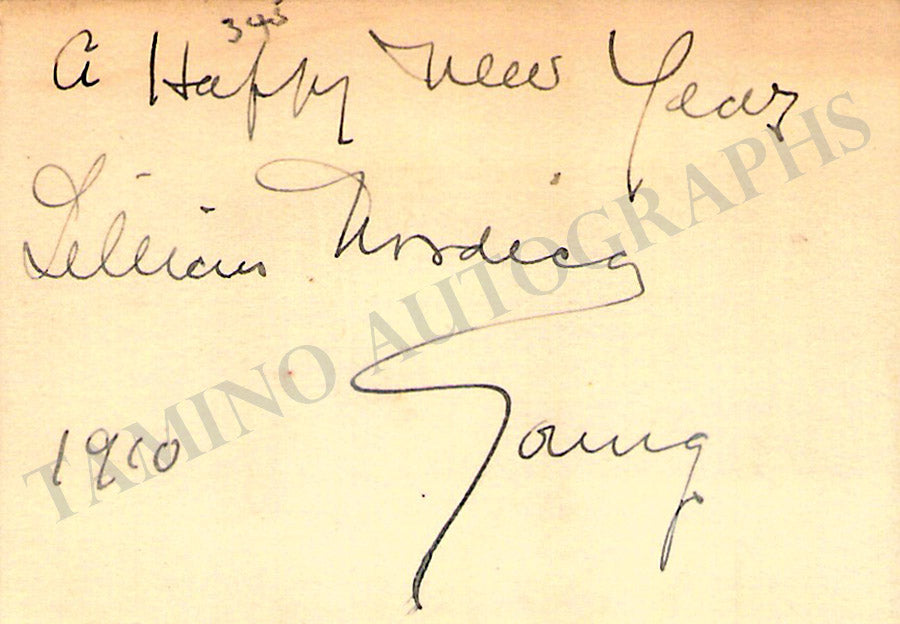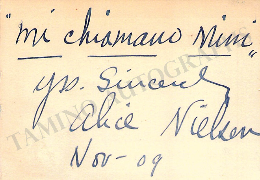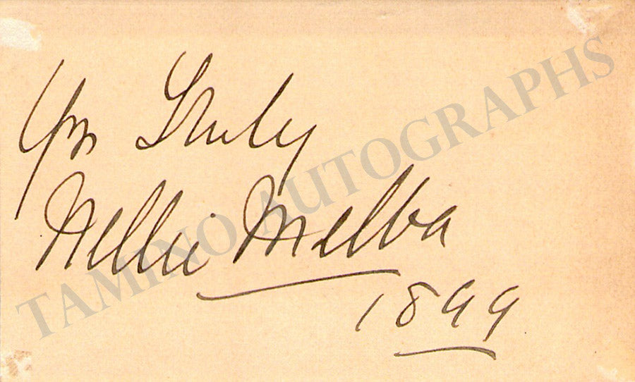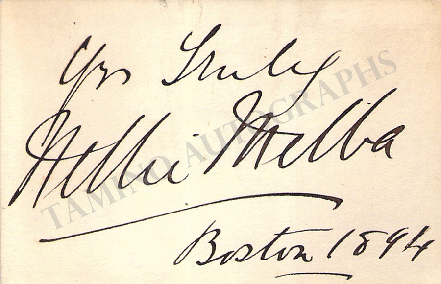 Business card of music fan Gladys Greeley signed by soprano Nielsen on the back with a short sentiment dated 1909. Size is 2.8 x 2 inches, in excellent condition.
