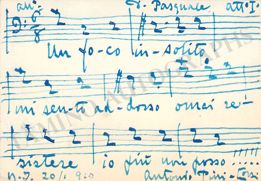 Business card of music fan Gladys Greeley signed by baritone Pini-Corsi with an 8-bar music quote from Donizetti's Don Pasquale, dated 1910. Size is 2.8 x 2 inches, in excellent condition.