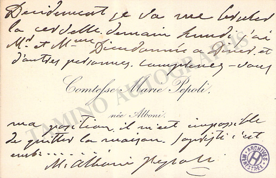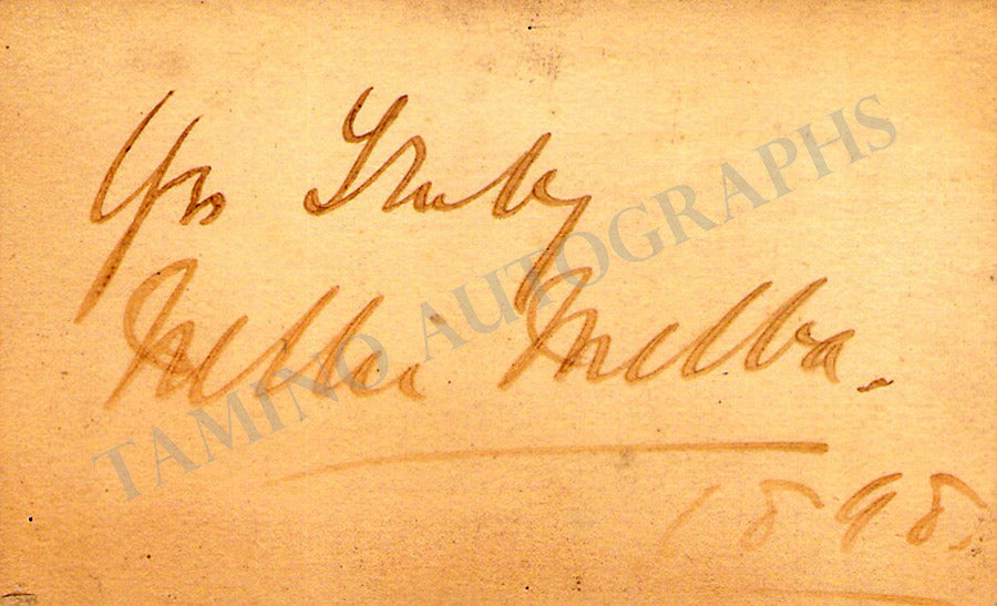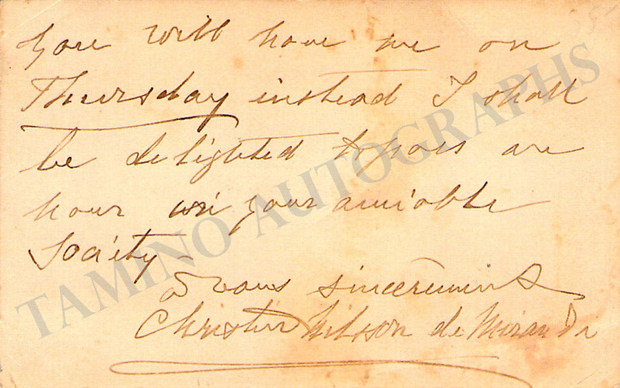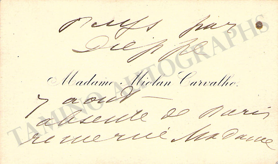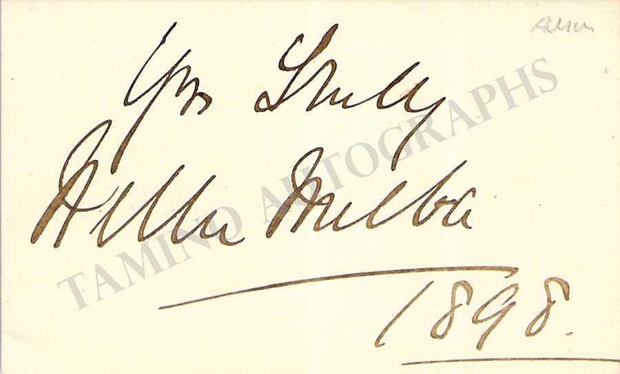 Her business card signed by her on verso with a short sentiment in English, dated 1898. Size is 3.25 x 2 inches, mounting traces on the front, overall strong age-toning, otherwise in very good condition.