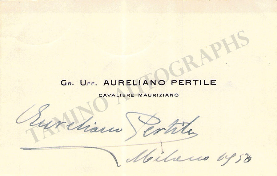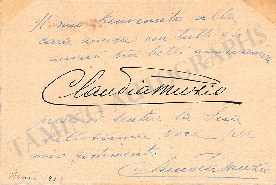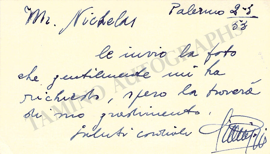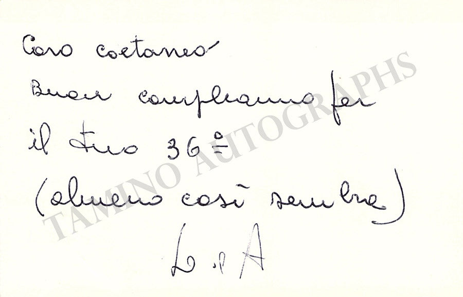 His visiting card with a written note in Italian signed by him. Size is 3.8 x 2.25 inches, central fold, in excellent condition.