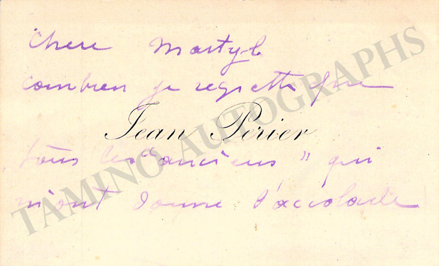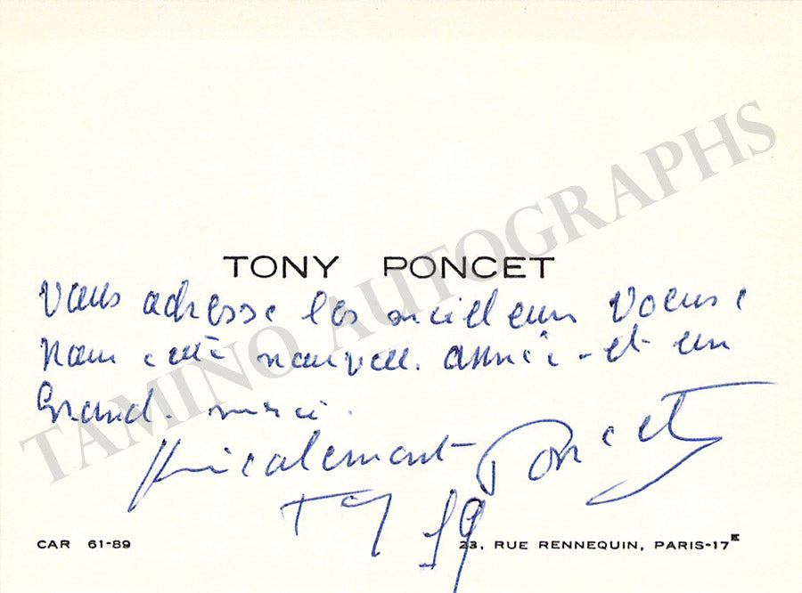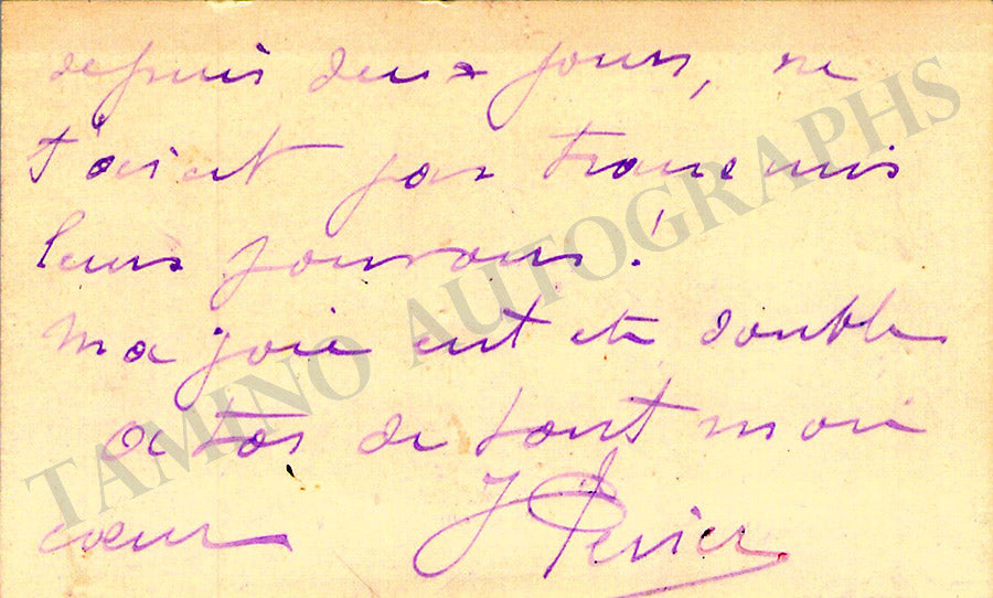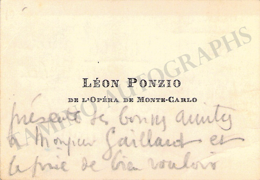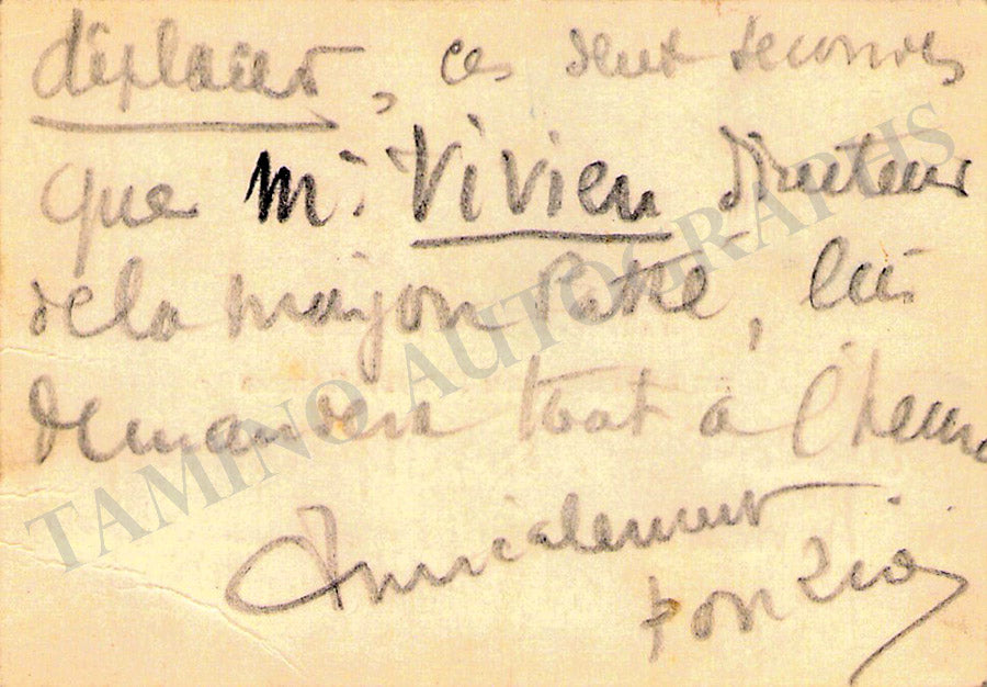 His original printed visiting card with a written note in French signed by him. Size is 3.8 x 2.3 inches, in excellent condition.