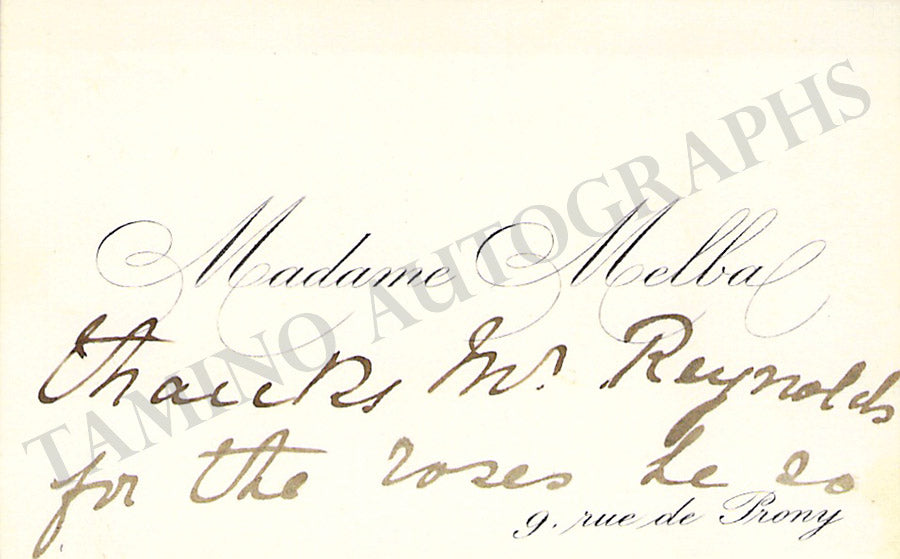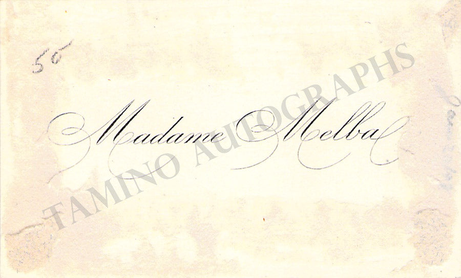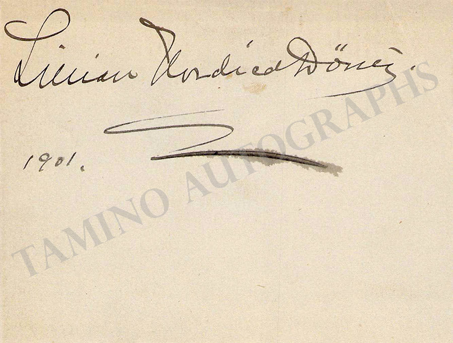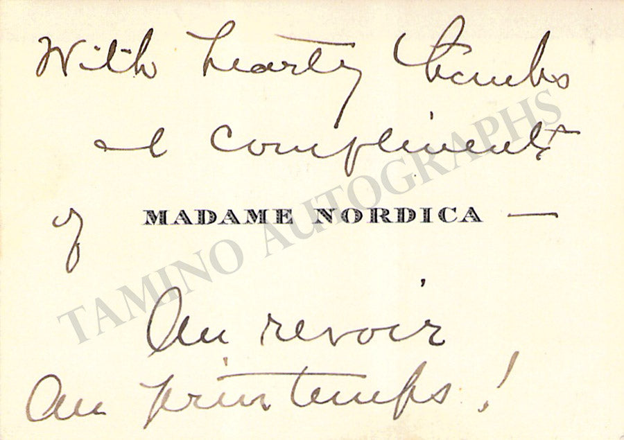 Original business card of music fan Gladys Greeley signed by Nordica on the back with a short greeting dated 1910. Size is 2.8 x 2 inches, in excellent condition.