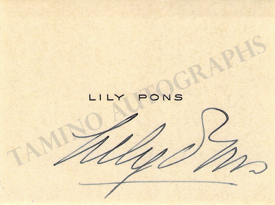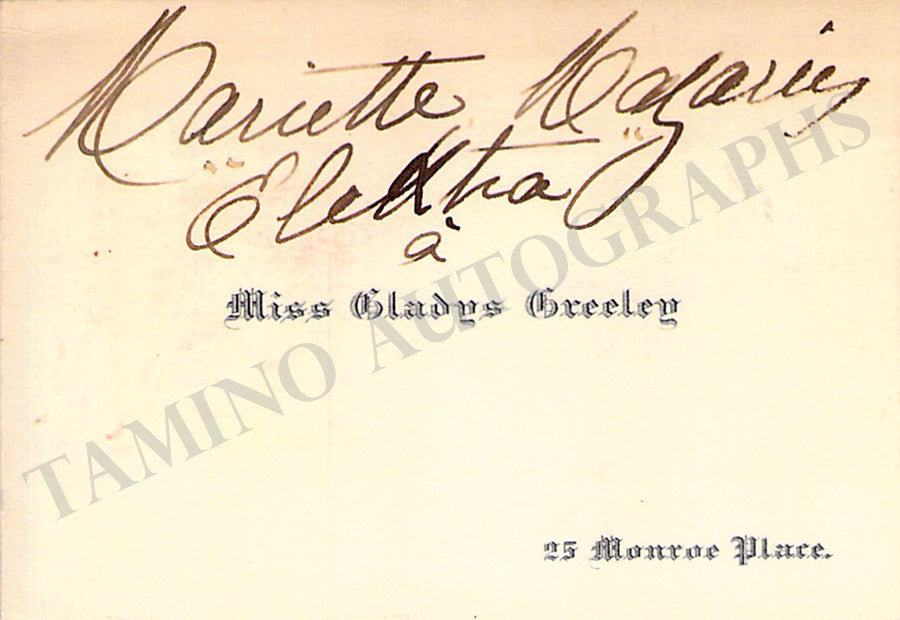 Business card of music fan Gladys Greeley signed by soprano Mazarin on the front with a short sentiment. Size is 2.8 x 2 inches, in excellent condition.