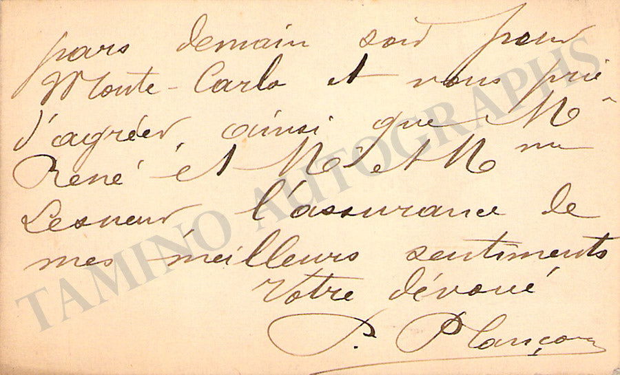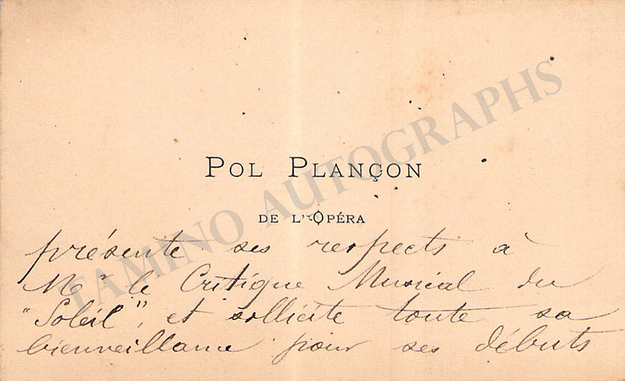 His business card with a long message in French written by him. Size is 3.75 x 2.4 inches, overall soft age-toning, in excellent condition.