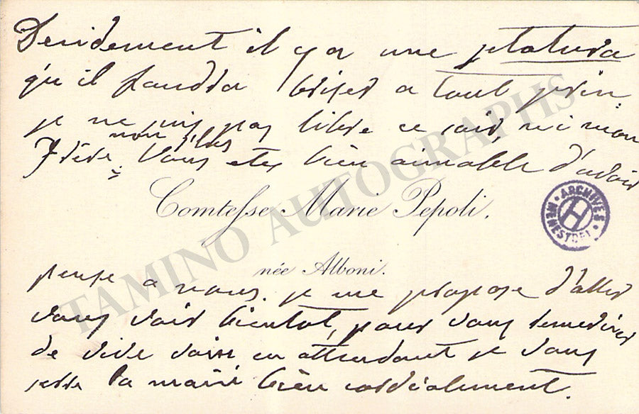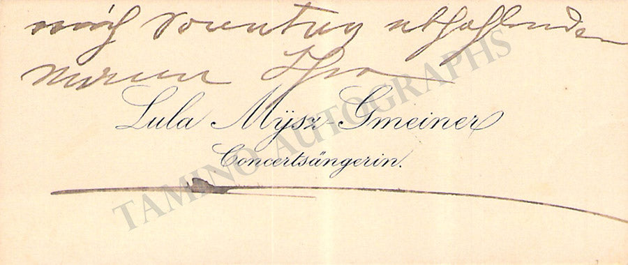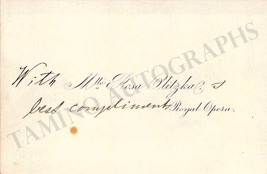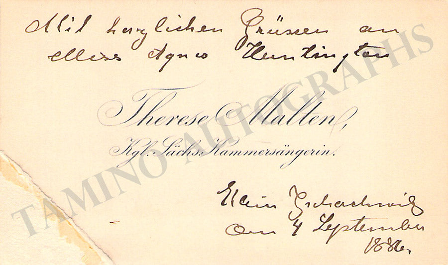Her original business card with a short text in German written by her and dated September 4, 1886. Size is 4.1 x 2.4 inches, mounting traces on the front, folds, in very good condition.
