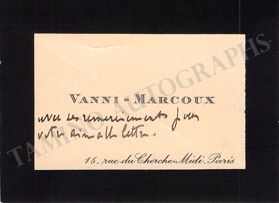 His original visiting card with a written note in French signed in pencil on verso. Size is 3.25 x 2.25 inches, in excellent condition.