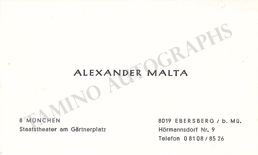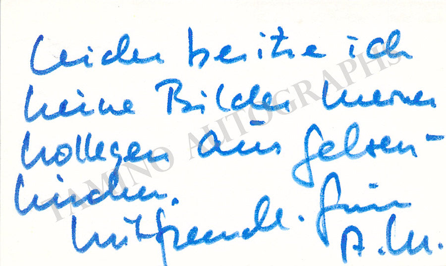 His business card signed by him with his initials on verso and a short message in German. Size is 3.9 x 2.4 inches, in excellent condition.