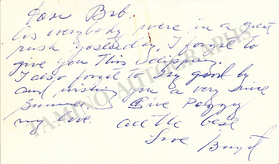 His business card signed by him with a short sentiment. Size is 4.1 x 2.5 inches, rust stains over the upper border, soft creases, in overall very good condition.