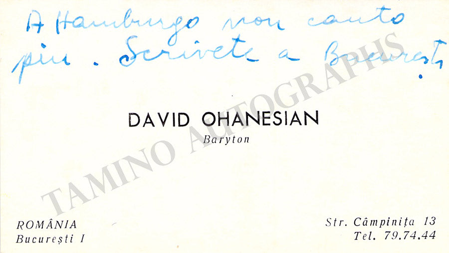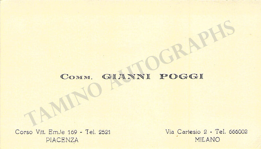 His business card with a short message in Italian written by him. Size is 3.75 x 2.1 inches, soft age-toning, in excellent condition.