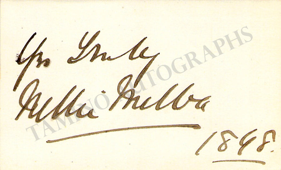 Her visiting card signed by her with a short sentiment dated 1899. Size is 3.25 x 2 inches, in excellent condition.