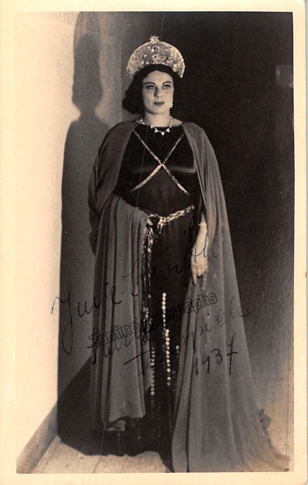 Hungarian soprano (1908-1994), signed photo postcard, shown as the Queen of the Night in Mozart's Die Zauberflote, her most celebrated role. Signed at the Salzburg Festival, dated 1937. Size is 3.3 x 5.25 inches with some bending at edges but otherwise in very good condition.