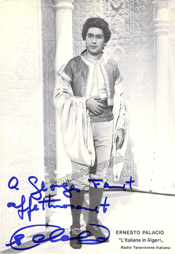 Peruvian tenor (b.1946), signed photograph, shown as Lindoro in Rossini's L'Italiana in Algeri, inscribed. Stamped on verso by photographer Georges Farret, Marseille.  Size is 5 x 7 inches, very small crease on top left, otherwise in excellent condition