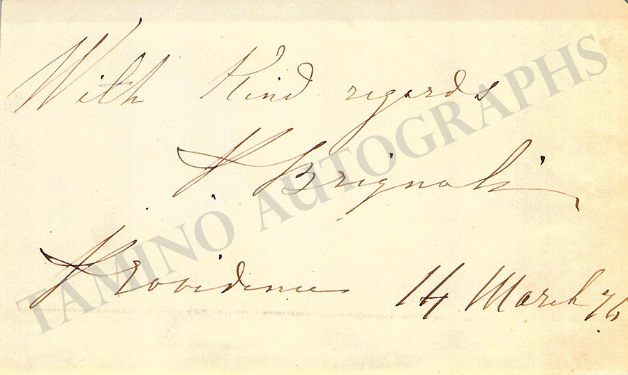 Fine card signed by him with a short sentiment dated in Providence, Rhode Island, 1876. Size is 5.3 x 3.25 inches, in excellent condition.