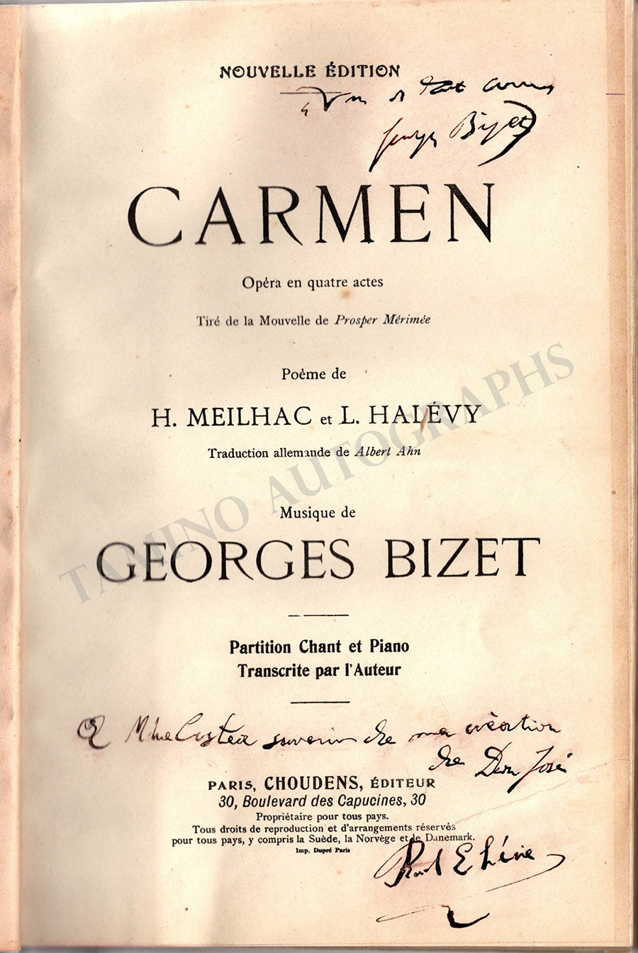 Early-1900s vocal score edition of Bizet's "Carmen" genuinely signed by the French tenor in the 1930s with a short sentiment in French, "In remembrance of my creation of Don Jose". Lhèrie added at the top a fake signature of the composer Georges Bizet and plus a short sentiment.