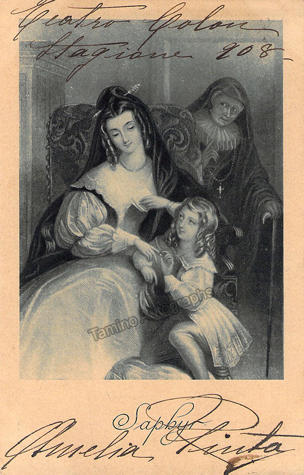 Italian soprano (1876-1946), postcard signed by her (not a photo of her), dated in 1908, bold handwriting and signature, size is 3.5 x 5.5 inches, in excellent condition. ALSO INCLUDED: unsigned half-tone photograph of her with young child, also 3.5 x 5.5 inches, in excellent condition. Not sold separately.