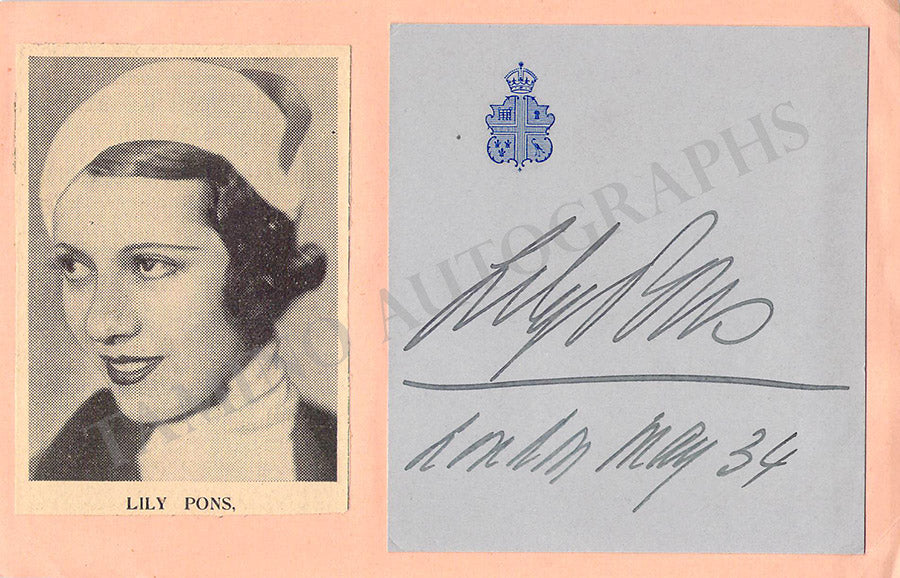 French-American coloratura soprano (1898-1976), a Metropolitan star for nearly 30 years. 3.25 x 3.75 inch signature cut, dated by her in 1934 mounted onto a card which also includes an unsigned 2.25 x 3.25 inch half-tone black and white photo of her shown as herself possibly taken from a newspaper or magazine. Total item size is 4 x 6.25 inches, in excellent condition.