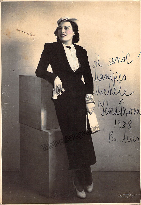 Bulgarian mezzo-soprano (1905-1979),  signed photograph, shown as herself, inscribed, dated in Buenos Aires in 1938. Blind stamped on front by pohtographer Treti. Size is 6.25 x 9.25 inches, some spots on verso, otherwise in very good condition.