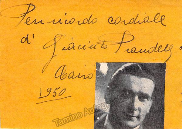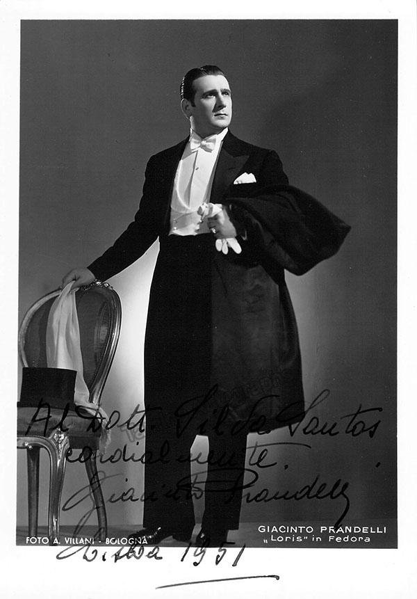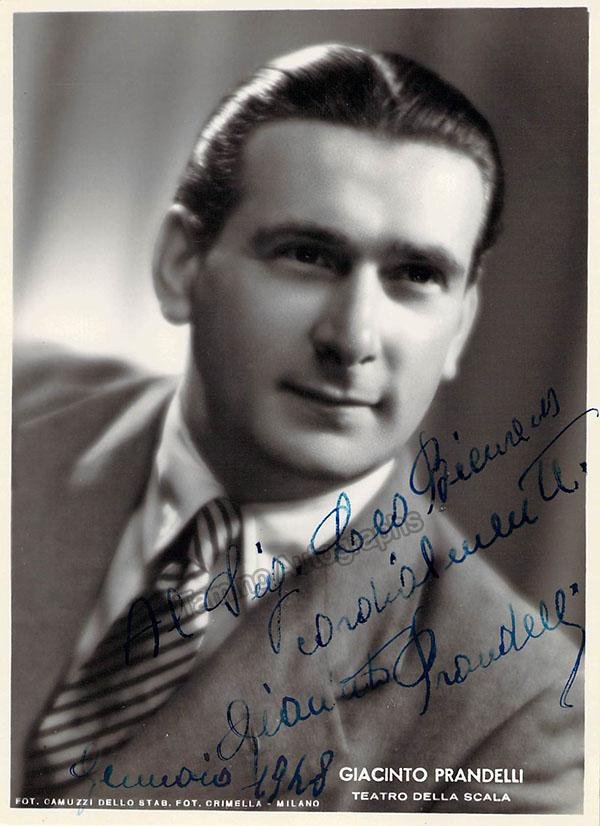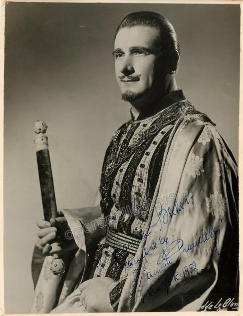 Beautiful black-and-white photograph signed and inscribed by him with a short sentiment dated 1945, here shown as Maurizio in Cilea's 'Adriana Lecouvreur'; photo by Teatro alla Scala (Milan). Size is 4 x 5.8 inches, in excellent condition.