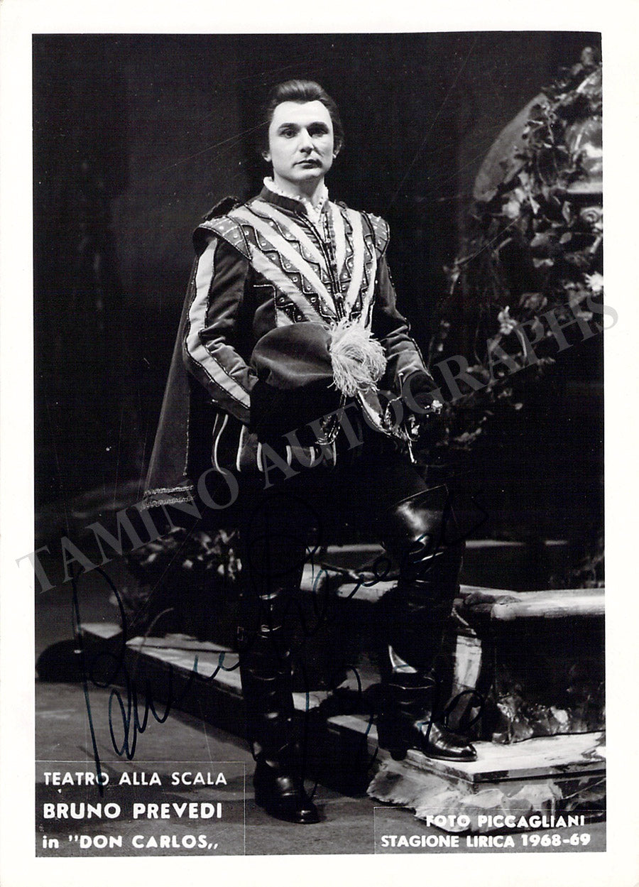 Signed photograph, shown in the title role of Verdi's Don Carlo, dated in 1970. Photo by Piccagliani, La Scala, Milan. Size is 4 x 5.75 inches, in excellent condition.
