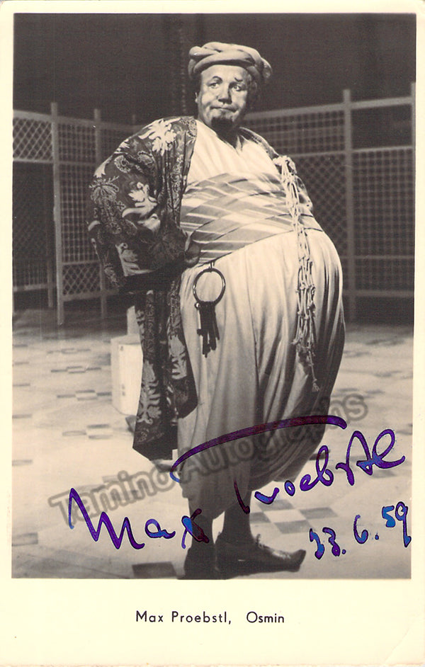 Signed photo postcard shown as Osmin in Mozart's Die Entführung aus dem Serail, dated in 1959. Stamped on verso by photographer Sabine Toepffer, Munich. Size 3.5 x 5.5 inches, in very good condition.
