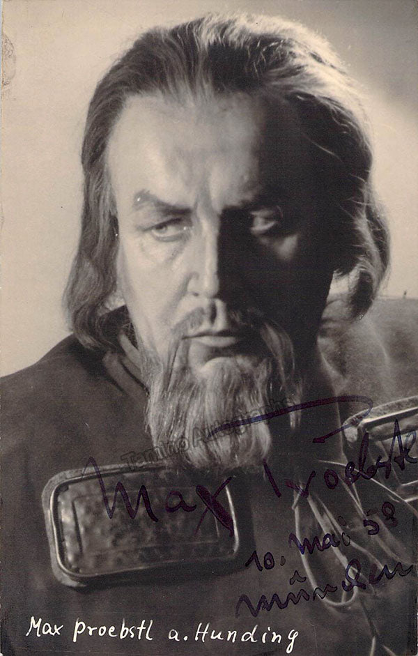 Signed postcard photograph, shown as Hunding in Wagner's Die Walkure, dated in Munich in 1958. Stamped on verso by Sabine Toepffer photo studio, Munich. Size is 3.25 x 5.25 inches, in excellent condition.