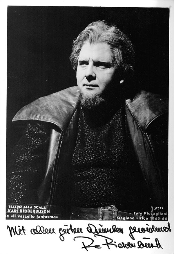 Beautiful black-and-white promo photograph signed by him with a short sentiment in German, shown in costume for the title role in Wagner's Der Fliegende Höllander at Teatro Alla Scala, Milano, season 1965-1966. Size is 4.1 x 6 inches, in excellent condition.