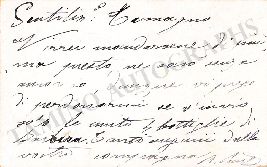 Short autograph note in Italian (sold untranslated) on her visiting card addressed to the famous Italian tenor Francesco Tamagno and signed by her. Size is 3.8 x 2.4 inches, in very good condition.
