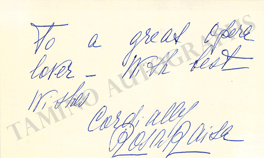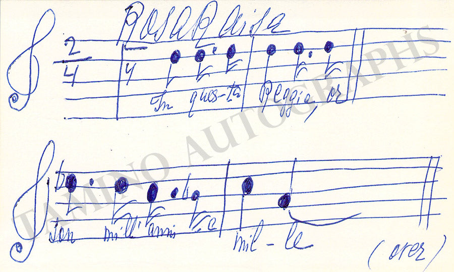 4-bar autograph music quote from Turandot's aria "In Questa Reggia" by Puccini on a card signed by Raisa with a short greeting on verso. Size is 4.9 x 2.9 inches, in excellent condition.