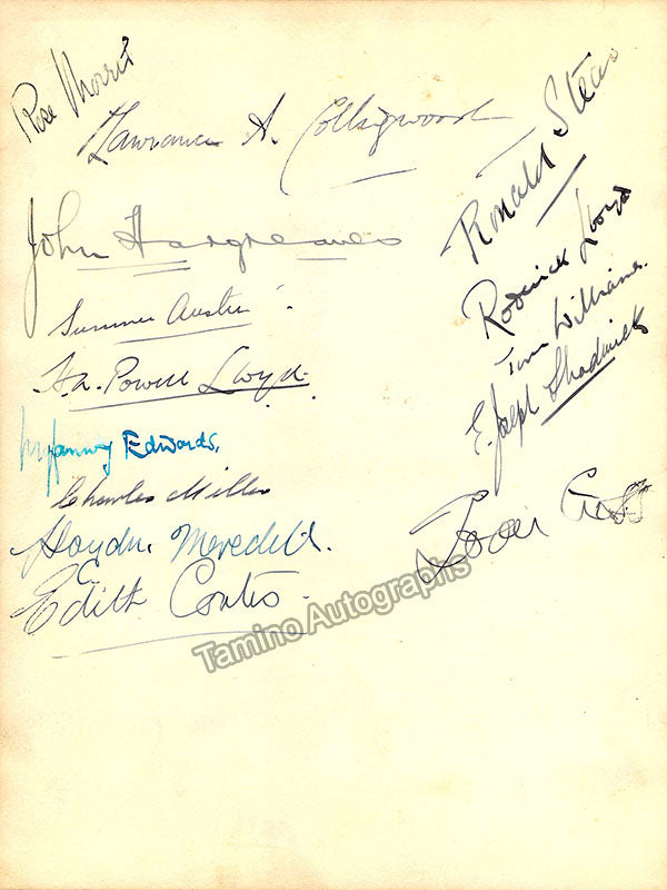 Photograph of many leading opera performers associated with the Sadler's Wells theatre in the mid-twentieth century containing many of their signatures on verso.  The prominent artists with signatures include English conductor and record producer Lawrence A. Collingwood, as well as soprano Joan Cross, mezzo-soprano Edith Coates, and tenor Powell Lloyd. Size is 6.25 x 8.25 inches, in excellent condition. Rare!