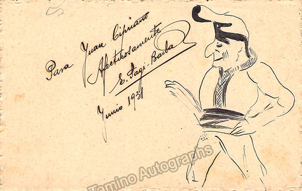 Spanish baritone (1876-1949), one of  the most important Spanish baritones of the first third of the twentieth century, also active in South America and became one of the most famous singers of zarzuela and operettas. Signed caricature, shown in role, inscribed, dated in 1931, bold handwriting and signature.  Size is 3.75 x 6 inches, in very good condition.