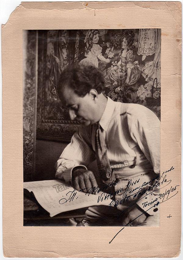 Italian bass (1878-1947) who had an important career as an opera singer in Italy during the first half of the XX Century.  Large signed photo mounted on a mat, shown as himself studying a score, inscribed to conductor Vittorio Gui, dated in Turin, 1925.  Total size is 10.1 x 14.5 inches, actual photo is 7.75 x 11.1 inches, large crease across the top of the mat, some cracks and creases over the lower border, loss of paper over the upper-left corner, priced accordingly.