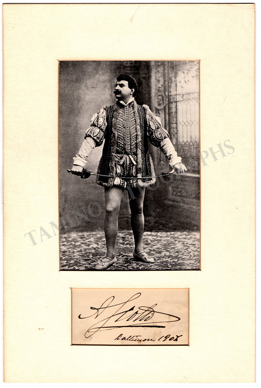 Signature cut, dated in Baltimore in 1908, 1.75 x 3.75 inches matted on the bottom portion of a very attractive larger mat. Also included in another window at the top of the mat is a 4.5 x 6.5 inch photograph of him in role. Total item size is 8 x 12 inches, some mounting traces on verso, otherwise in excellent condition.