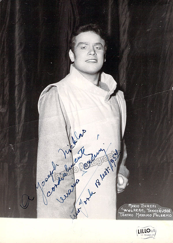 Italian baritone (1928-2015), signed photograph, shown as Wolfram in Wagner's Tannhauser at the Teatro Massimo, Palermo, inscribed and dated in New York in 1957. Photo by Lillo photographers, Palermo. Size is 5 x 7 inches, small creases on edges, otherwise in good condition.