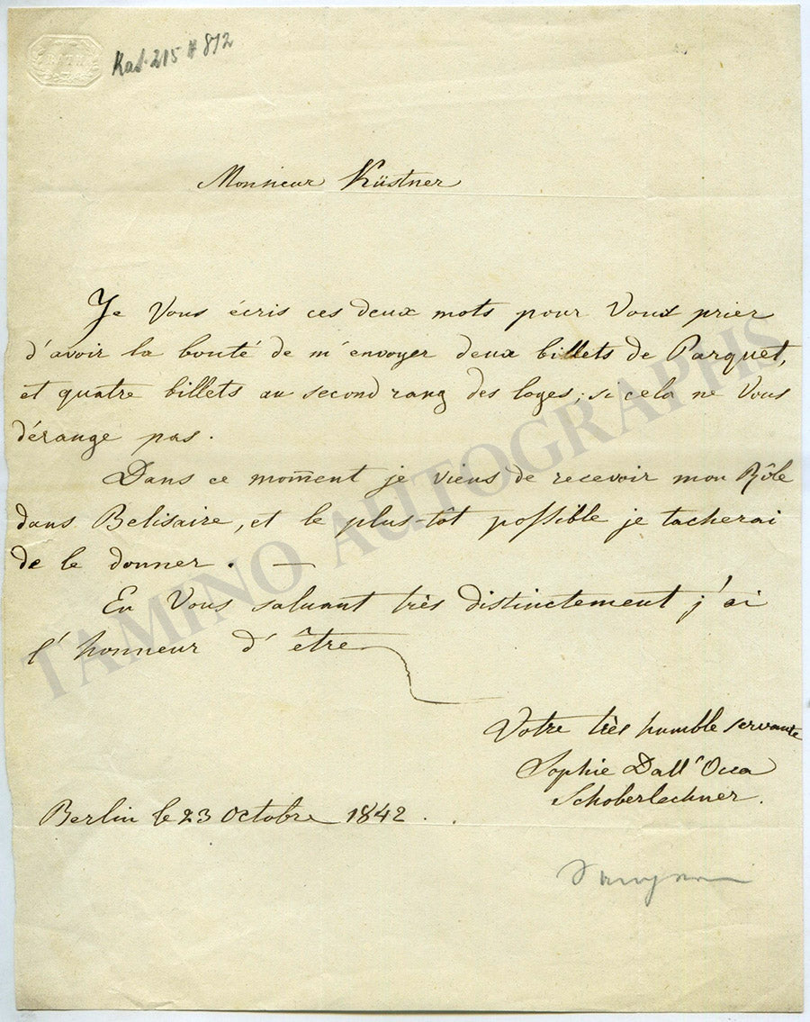 A. Berlin le 23 Octobre 1842. To the Court theatre manager Karl Theodor von Küstner, asking for: “…deux billets de parquet et quatre billets au second rang des loges (…) Dans ce moment je viens de recevoir mon rôle dans Belisaire, et le plus-tôt possible je tacherai de le donner…”. 1 p. In-4.