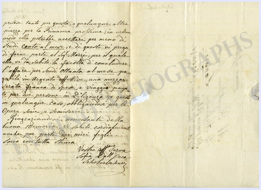 B. Fano li 22 Febbrajo 1850. To the impresario Alessandro Lanari: “…in questo momento ho riceguto la vostra lettera, e ne feci parte alla mia figlia la quale per verità rimase assai mortificata nel vedere che il Sig. Marzi dopo tante dimostrazioni, e conoscendo i suoi mezzi, le abbia potuto fare questa meschina offerta, e sopra più anche obbligandola di fare le opere buffe, le quali sono affatto fuori del suo genere, e ch’essa non azzarderebbe di cantarle altro che avendo di già piaciuto in una città dopo una o due opere del suo genere…”.  2 pp. In-8.