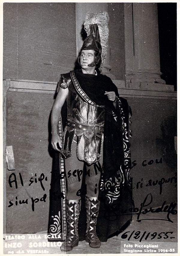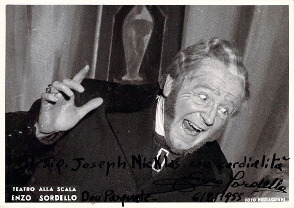 Signed photograph, shown in role in Donizetti's Don Pasquale, inscribed and dated in 1955. Photo by Piccagliani, La Scala, Milan. Size is 4 x 5.5 inches, mounting tape traces on verso, otherwise in excellent condition.