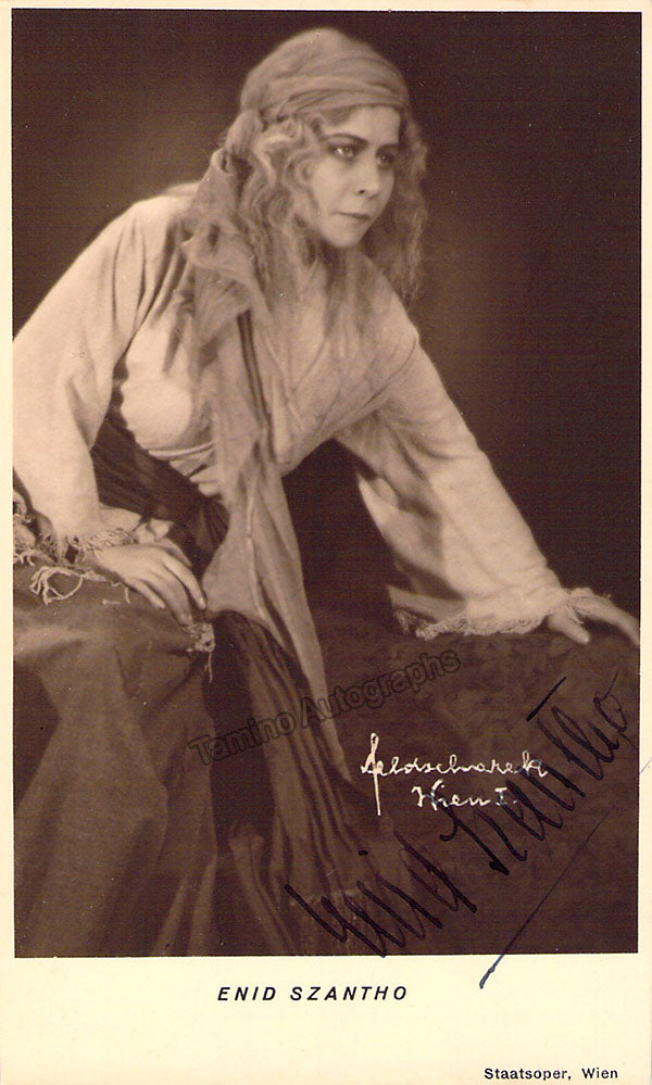 Hungarian contralto (1907-?), signed postcard photograph, shown in role (possibly Azucena in Verdi's Il Trovatore). Printed signature of photographer on front of photo. Size is 3.25 x 5.25 inches, in excellent condition
